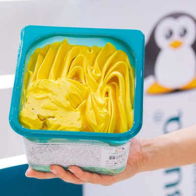 Легкое мороженое из пюре манго и гуавы с банановым джемом Состав: молоко коровье пастеризованное, фруктоза, пюре манго, вода, сыворотка молочная су