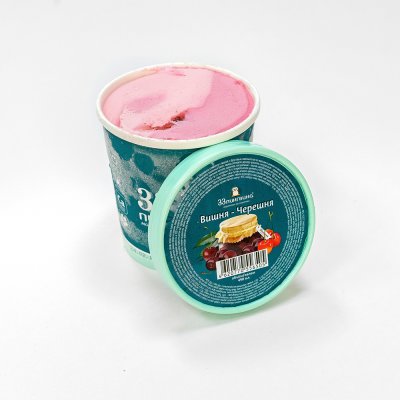 Мороженое сливочное с вишней, с фруктовым наполнителем из черешни и джемом из вишни Состав молоко коровье пастеризованное, молоко цельное сгущенно