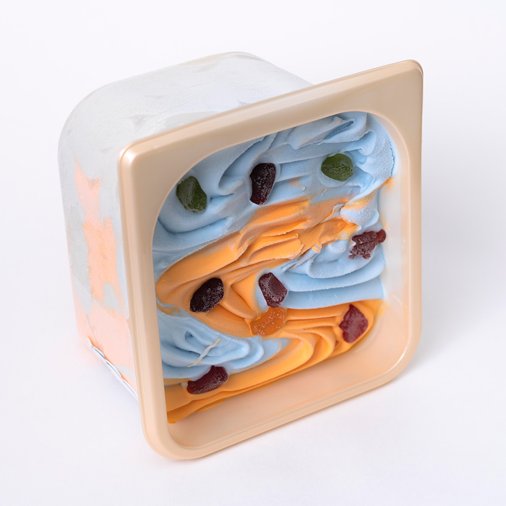 Двухслойный пломбир с дыней, ананасом и кокосом, декорированный жевательным мармеладом